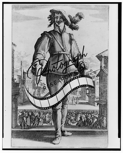 The captain, Print shows Capitano, a stock character in the Commedia dell'arte, with theatrical stage set and spectators in background.