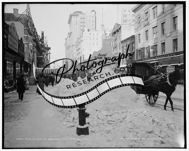 Piles,drifts,snow,Broadway,after storm,blizzard,buildings,cart,New York,NY,c1905