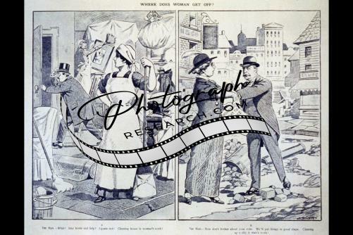 Where does woman get off?,c1912,Woman's Work,cleaning house,right to vote,man
