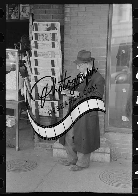 Reading newspaper in front of newsstore,Laurel,Mississippi,MS,FSA,1939