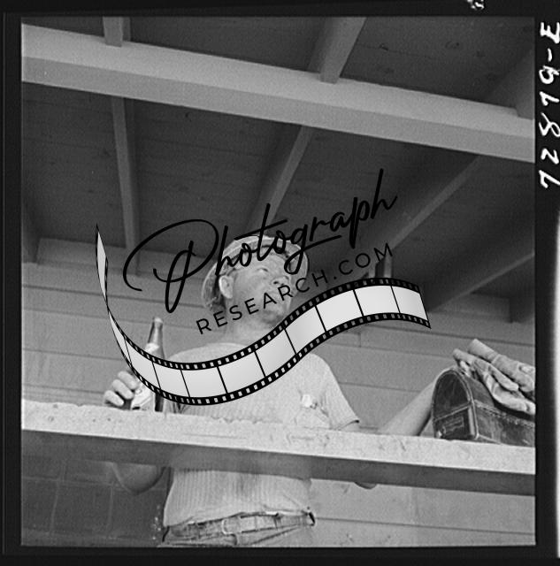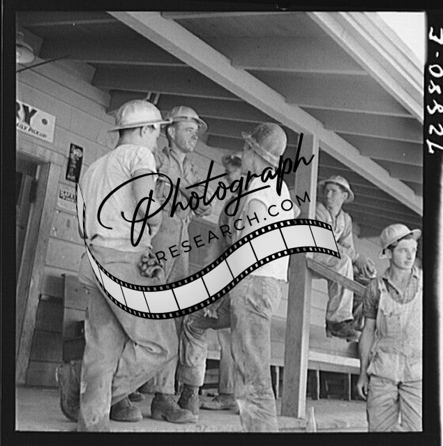Title: Shasta Dam, Shasta County, California. Workman on the porch of the commissary