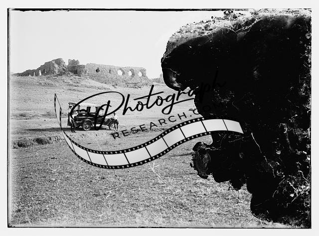 People in car near ruins,Automobile,Middle East,Matson Photograph Collection