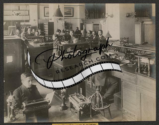 Interior of the Yokohama Specie Bank,men working at their desks,1900-1915?