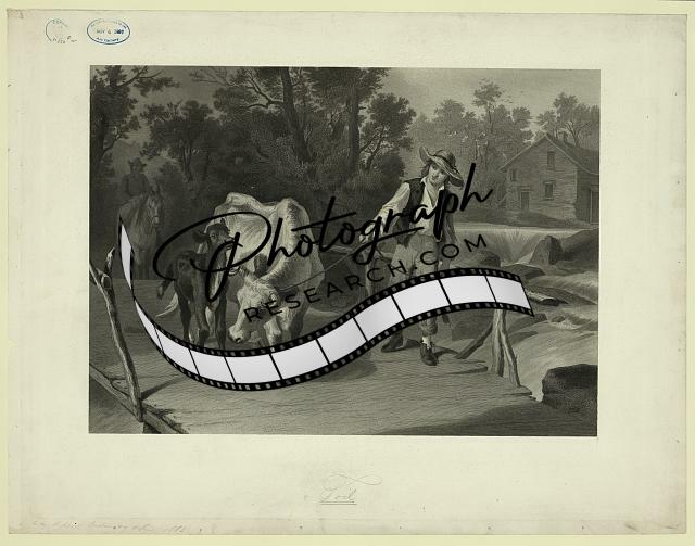 Toil,1883,farmer on farm with mother and baby cow,barn