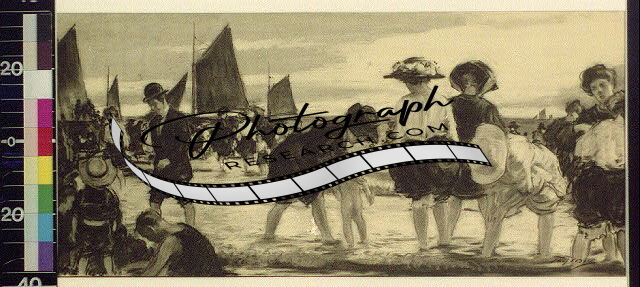 The sands are dotted with striped red-and-white tents,Frank Walter Taylor,1912?