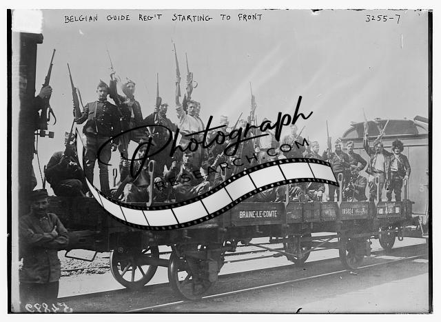 Belgian guide regiment starting to front,men,guns,Train car,RR,Bain News Service