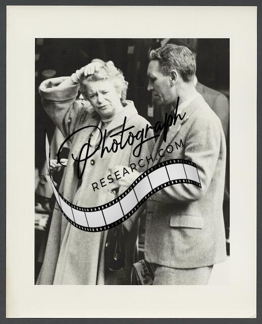 [[Spectators, half-length portrait, standing on sidewalk, looking towards an elep