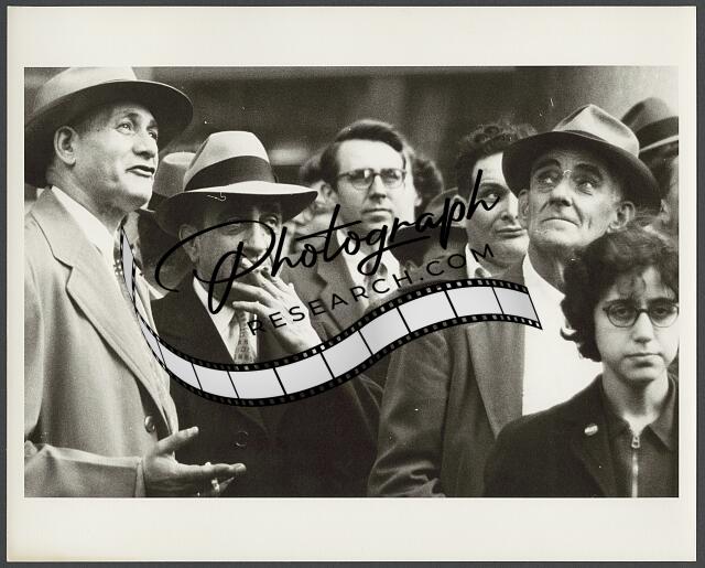 [[Spectators, half-length portrait, standing on sidewalk, looking towards an elep