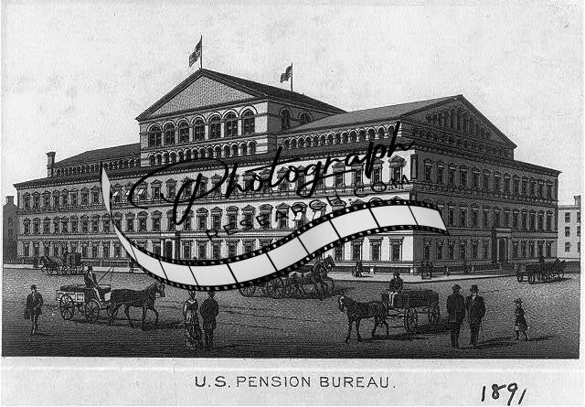 Exterior view of the U.S. Pension Bureau,1891,Horses