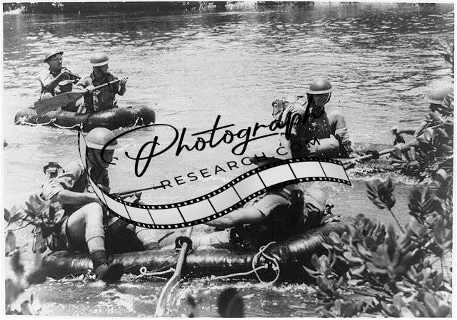 Australian soldiers,tommy guns crossing jungle water,inflated rafts,Malaya,c1941