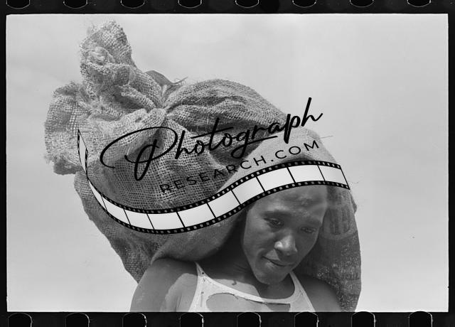 Stevedore with sack of oysters,Olga,Louisiana,LA,Farm Security Admin,FSA,1938