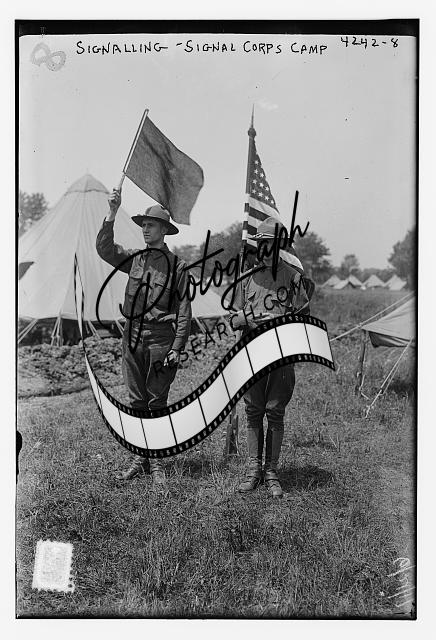 Signalling -- Signal Corps Camp,American flag,two men,soldiers,military
