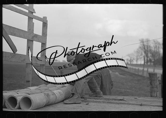 Tip Estes loading tile on a wagon,Fowler,Indiana,IN,Farm Security Admin,FSA