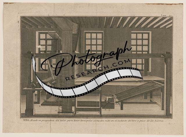 Seda. Alzado en prespectiva del telar para texer terciopelos corta dos, visto en el instante del tiro y paso de los hierros