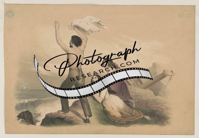 Shipwrecked, Print shows a man and two women on shore, a ship sailing the distance.