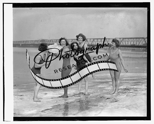 Five women in swimsuits on icy beach,2/23/24,Bathing Beauties,Summer Fun,1924