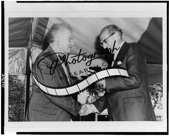 Edgard Varese shaking hands,Aaron Copland,receiving presentation,B Perry,1961