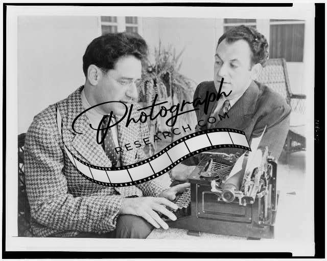 George Kaufman using typewriter,Moss Hart talking,1937,playwrights,outside