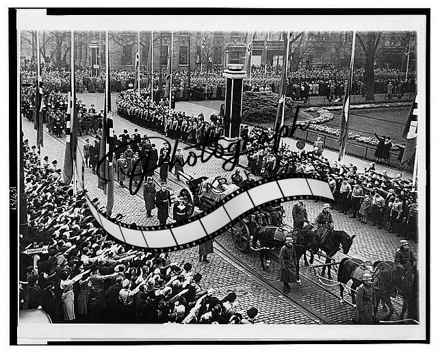 Nazis mourn for slain envoy, The body of Ernst vom Rath in a casket draped in Nazi flag carried on a horse-drawn carriage with cannon, Dusseldorf, Germany.