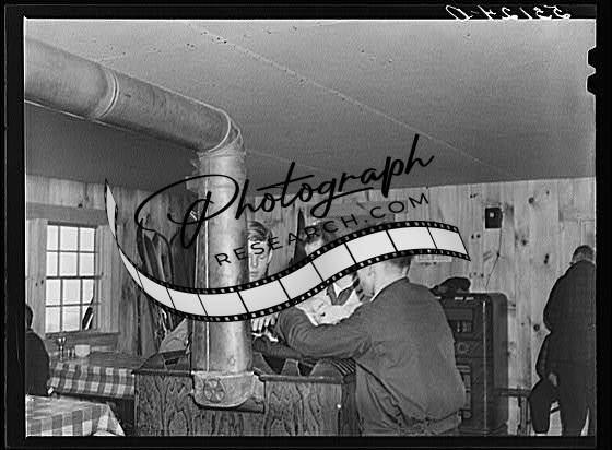 Title: Skiers in ski hut built by Clinton Gilbert, farmer in Woodstock, Vermont