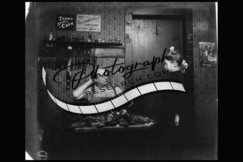 Cobbler at work bench,girl,c1903,Shoemaker,Fitz Guerin,Terms Strictly Cash