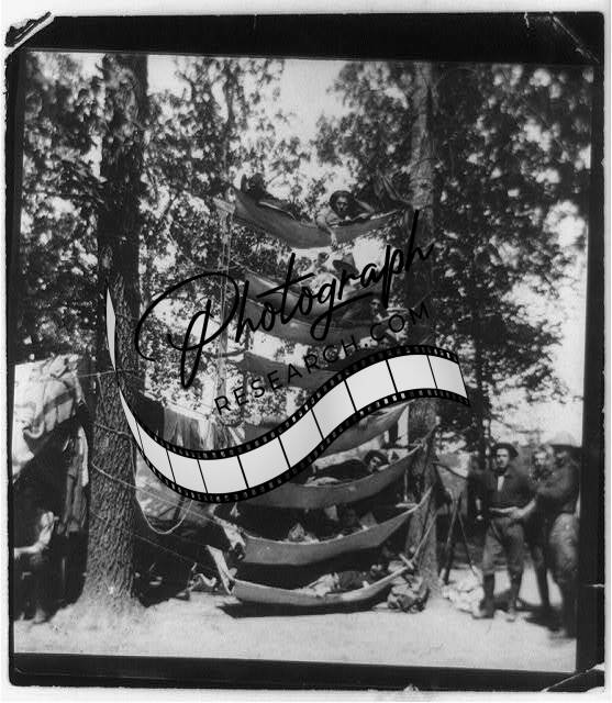 Airy bedrooms,men,hammocks,trees,camping,furniture,equipment,outdoors,c1899