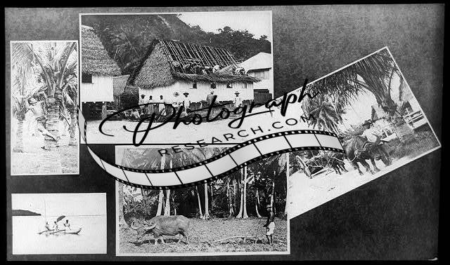 Guam,c1912,water buffalos,natives,thatched roof house,cocnuts,machete