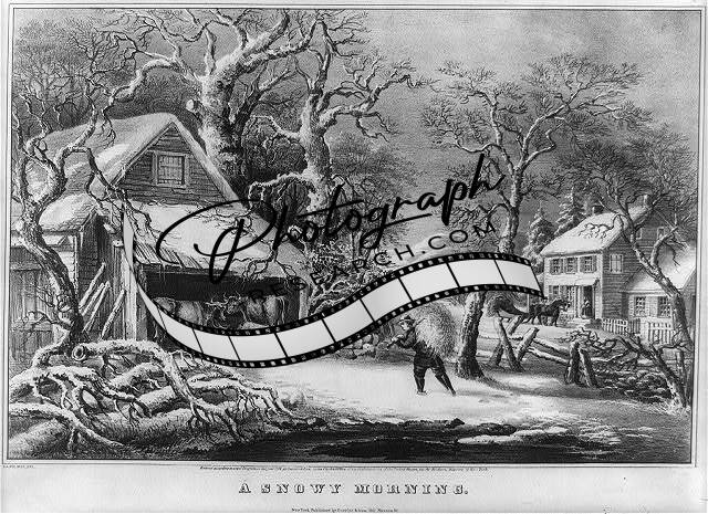 A snowy morning,c1864,Frances F Palmer,livestock,barn,house,man,trees,photo