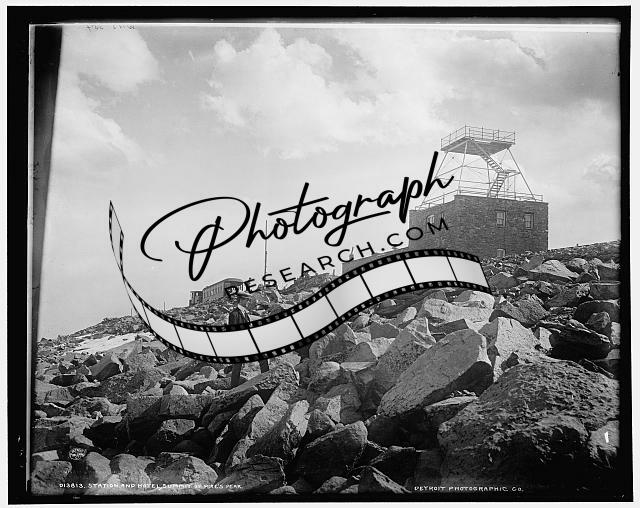 Station,railroad buildings,hotel,summit,Pike's Peak,mountains,Colorado,CO,c1900