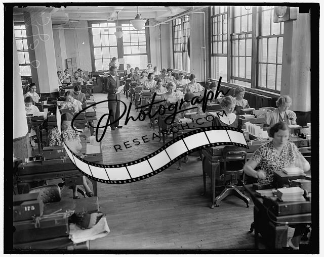 Title: Exactly what happens to each of the millions of Social Security Account applicants during each working shift is recorded daily. At any minute of the day or night it is possible to locate any application through the records maintained in the production and control section of the Social Security Board Records Office. This is the nerve center of the 'greatest bookkeeping job in the world'. The photograph above shows workers in the records office running off daily production report, which accurately pictures details of the ebb and flow of each of the several operations necessary to set up an individual ledger account for each worker and the various indexes prepares to insure acccuracy and ready reference.