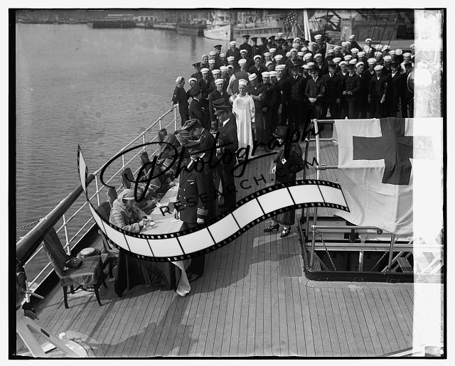 Miss Marjorie Wright pinning cross button on cook of Mayflower,11/5/24,1924