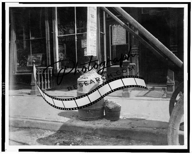 Ashbarrel,old,disposal,streets,buildings,sidewalks,New York,NY,J Riis,c1888
