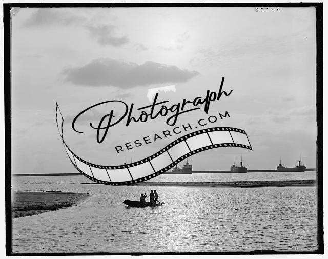 Sunset across harbor,cargo ships,freighters,boats,Buffalo,New York,NY,1900