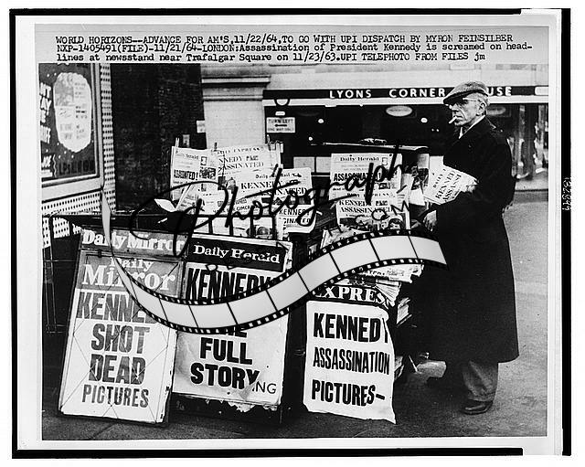 Assassination of President Kennedy is screamed on headlines at newsstand near Trafalgar Square on 11/23/63