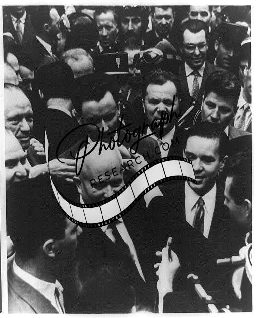 Nikita Krushchev in crowd of reporters with microphones at exhibition in Moscow, which displayed parts of the wrecked plane used by pilot Francis Gary Powers