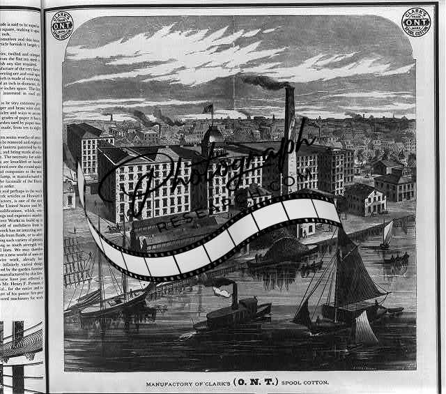 Manufactory of Clark's spool cotton,New York City,waterfront scene,ships