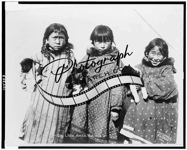 Six little Arctic natives,Eskimos,Inuits,children,clothing,puppies,dogs,c1904