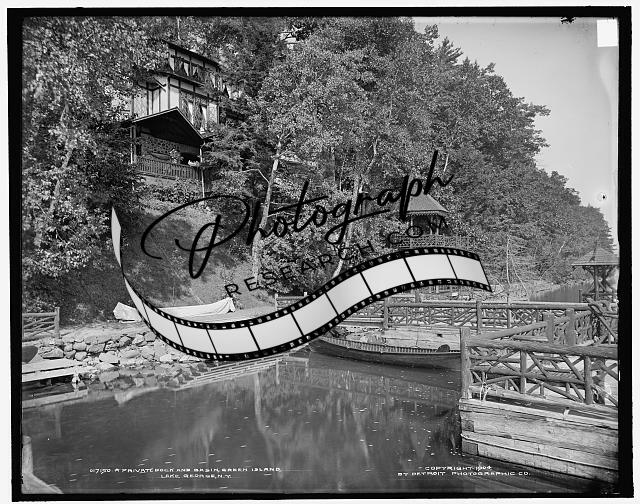 Private dock,basin,piers,docks,canoes,Green Island,Lake George,New York,NY,c1904