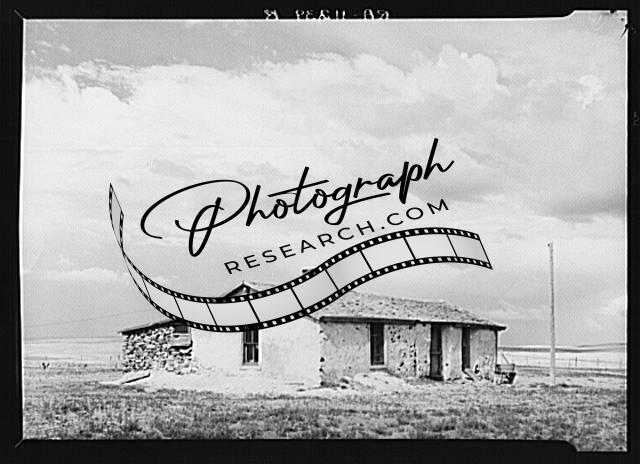 Title: Sod and stone farmhouse near South Heart, North Dakota. Note wagon containing barrels for hauling water