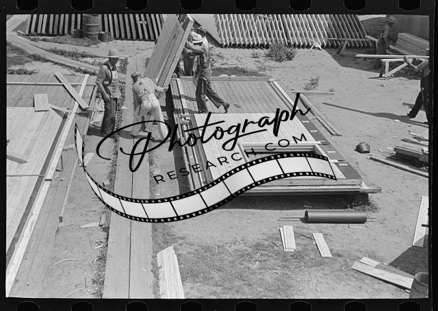 Title: House plant. Wall panels are framed on table in foreground and then stacked ready for finishing. Southeast Missouri Farms Project