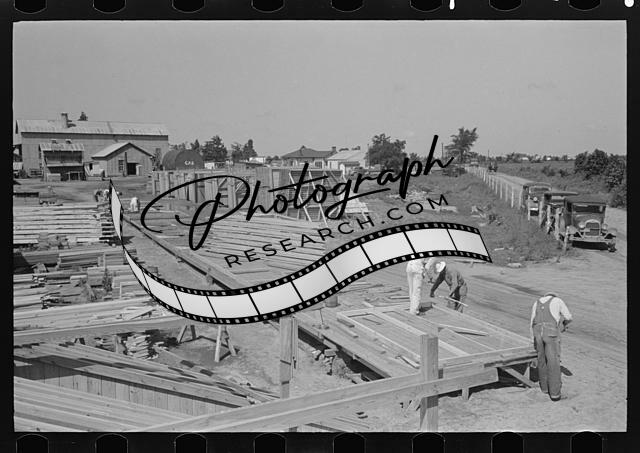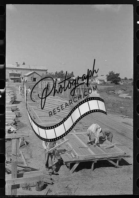 Title: Southeast Missouri Farms Project. House erection. Shop assembled trusses are raised in place by regular erection crew of five men. No scaffolding is necessary for this operation