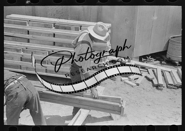 Title: Stack of engineering stakes precut in the shop house plant. Southeast Missouri Farms Project