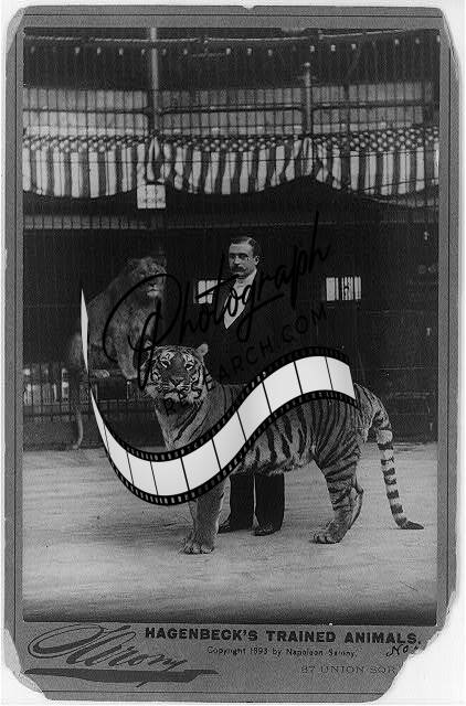 Hagenbeck's trained animals,Man in cage with tiger,lion