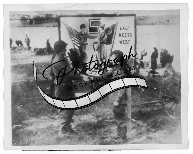 Frank Huff (left), of Washington, Va., Torgau, 58 miles southwest of Berlin, April 25, shakes hands with a Russian soldier to symbolize the meeting of the two armies at the Elbe River