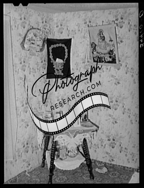 Title: Sideboard weighed down with photographs in Spanish-American home in Taos County, New Mexico