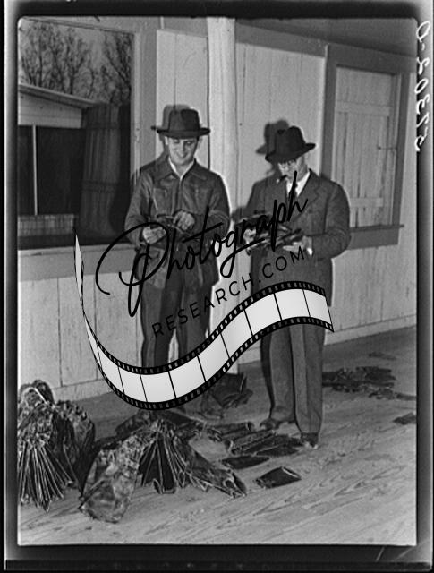 Title: Fur buyers grading muskrats at auction sale in dance hall in Delacroix Island, Louisiana