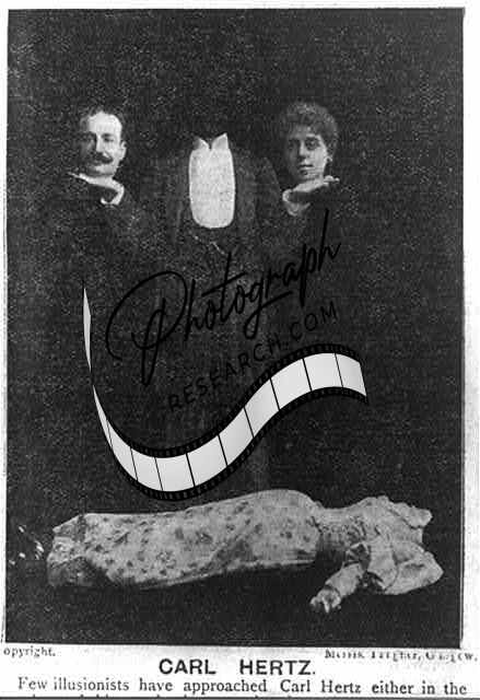 Magician Carl Hertz,1859-1924,holding two severed heads - his own,his wife's