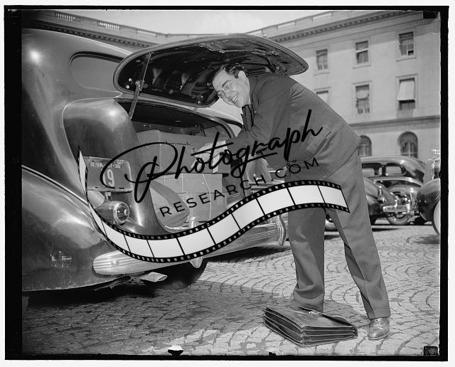 Ready for home,Senator Rush D Holt,packs his automobile,car,Washington DC,1938