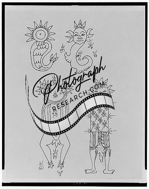 Two stylized figures and the ongkara symbol, possibly used as amulets against witches
