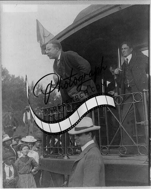 President Theodore Roosevelt speak,back,railroad car,Whistle-stop campaign,c1907